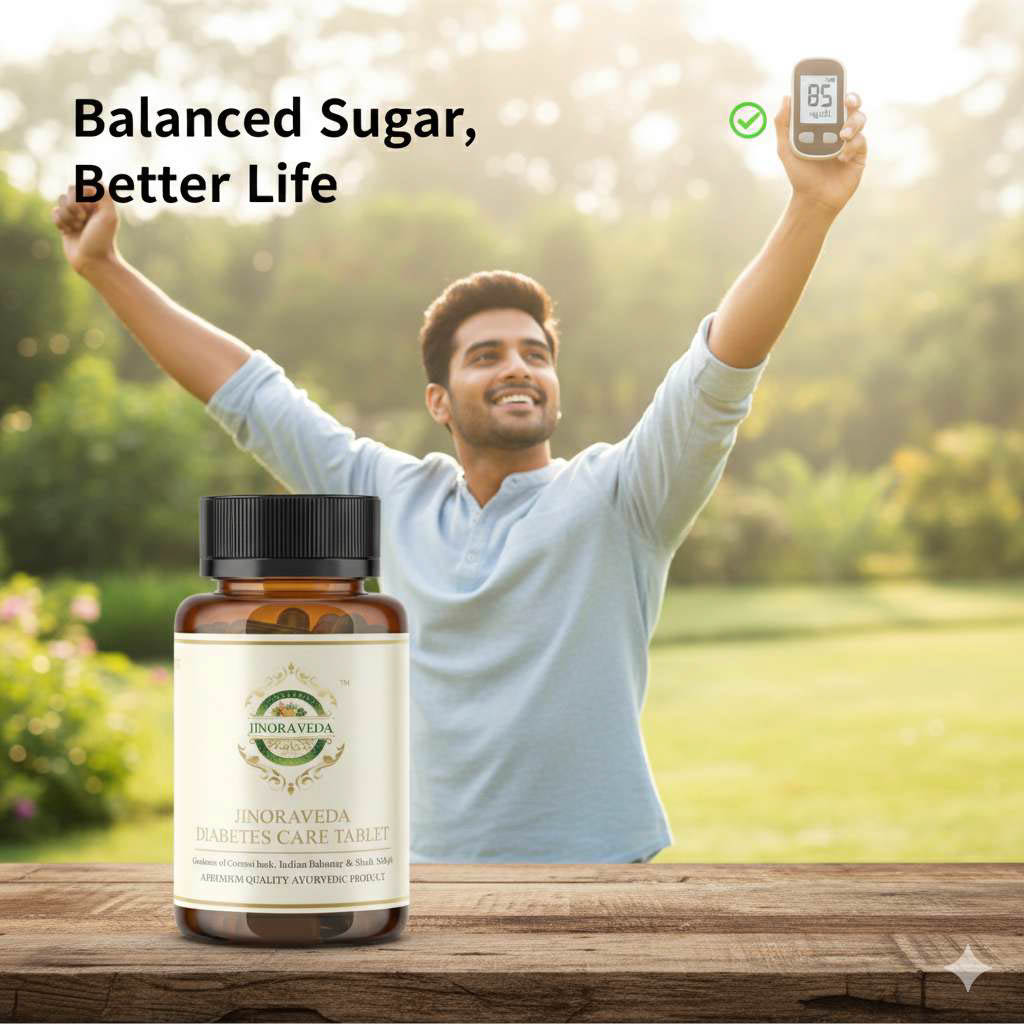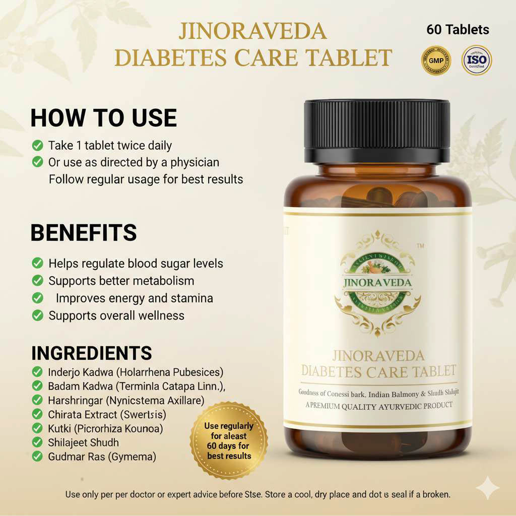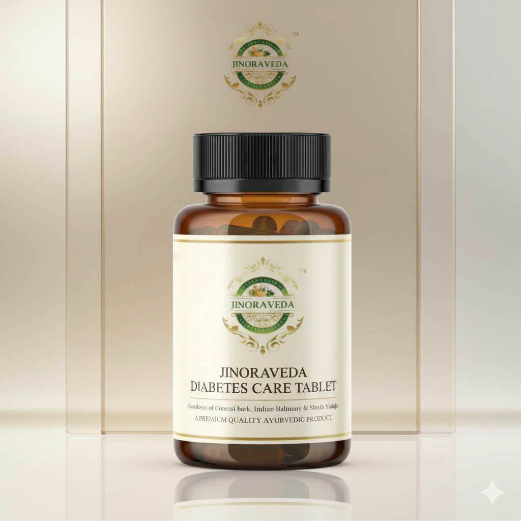 JINORAVEDA Diabetes Care Tablet is a carefully crafted Ayurvedic formulation designed to support healthy blood sugar levels, improve metabolic balance and promote overall wellness — the natural way.