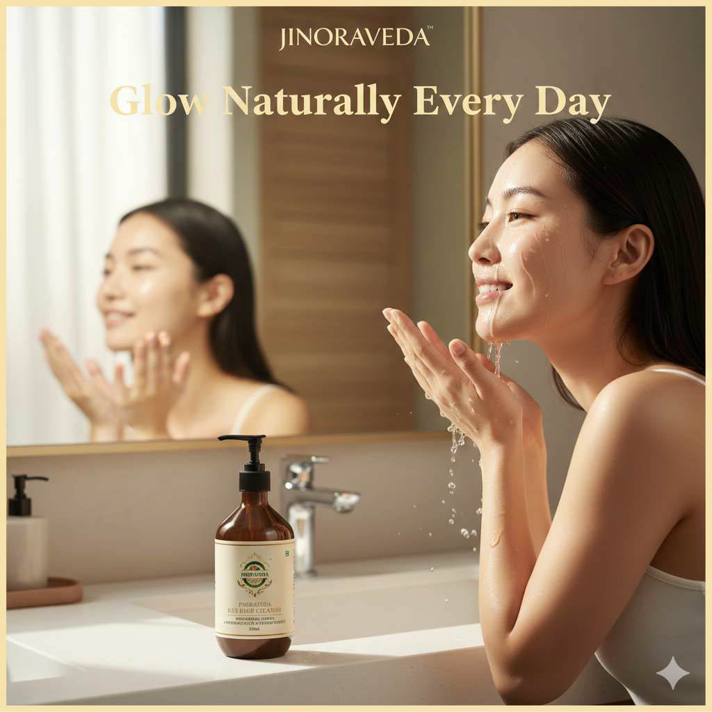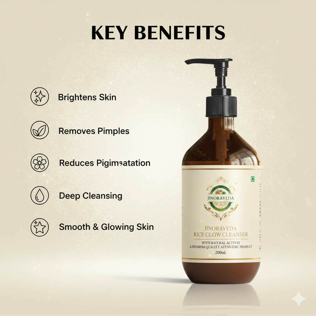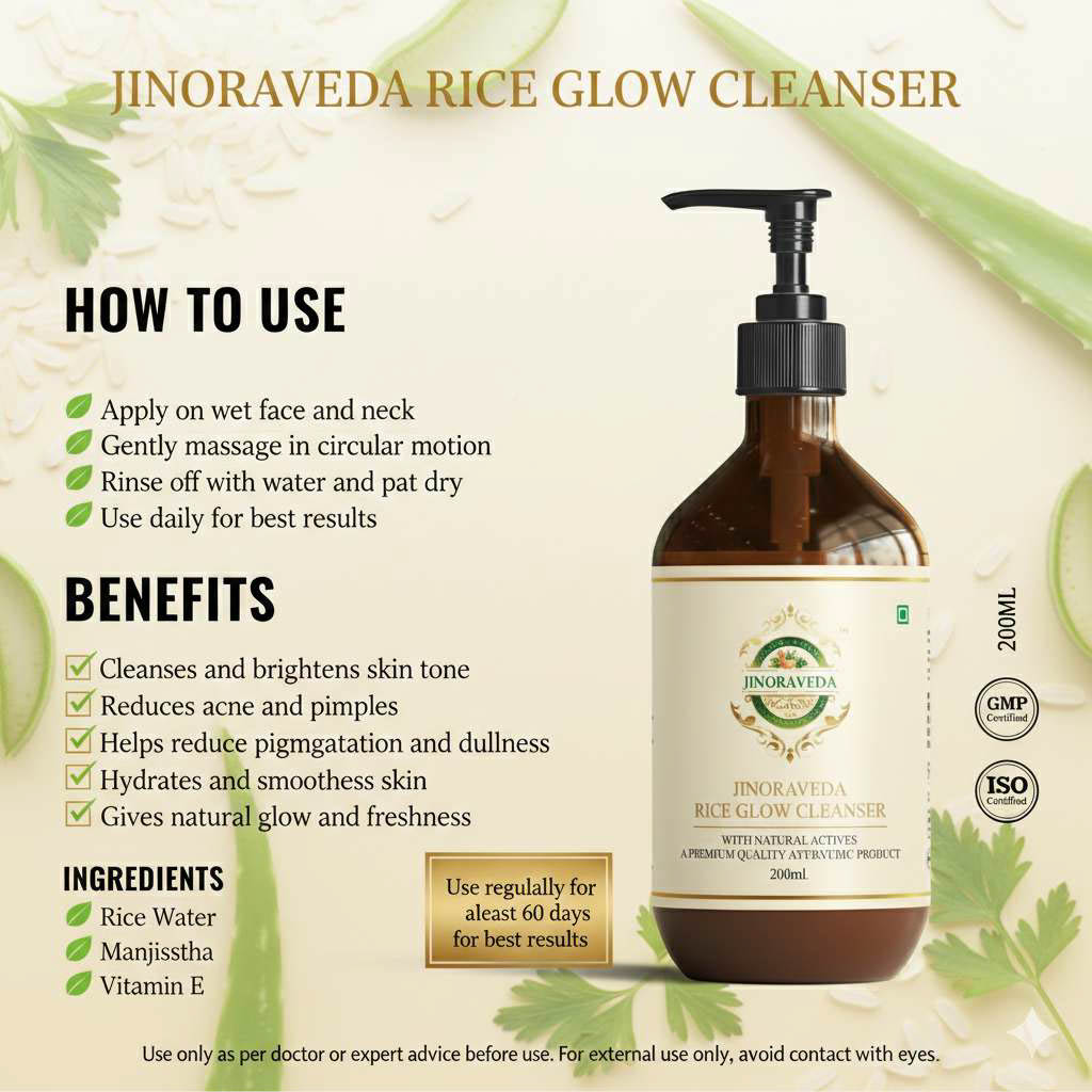 JINORAVEDA Rice Glow Cleanser is a premium Ayurvedic formula designed to deeply cleanse, brighten and rejuvenate your skin — giving you a natural, healthy glow without harsh chemicals.