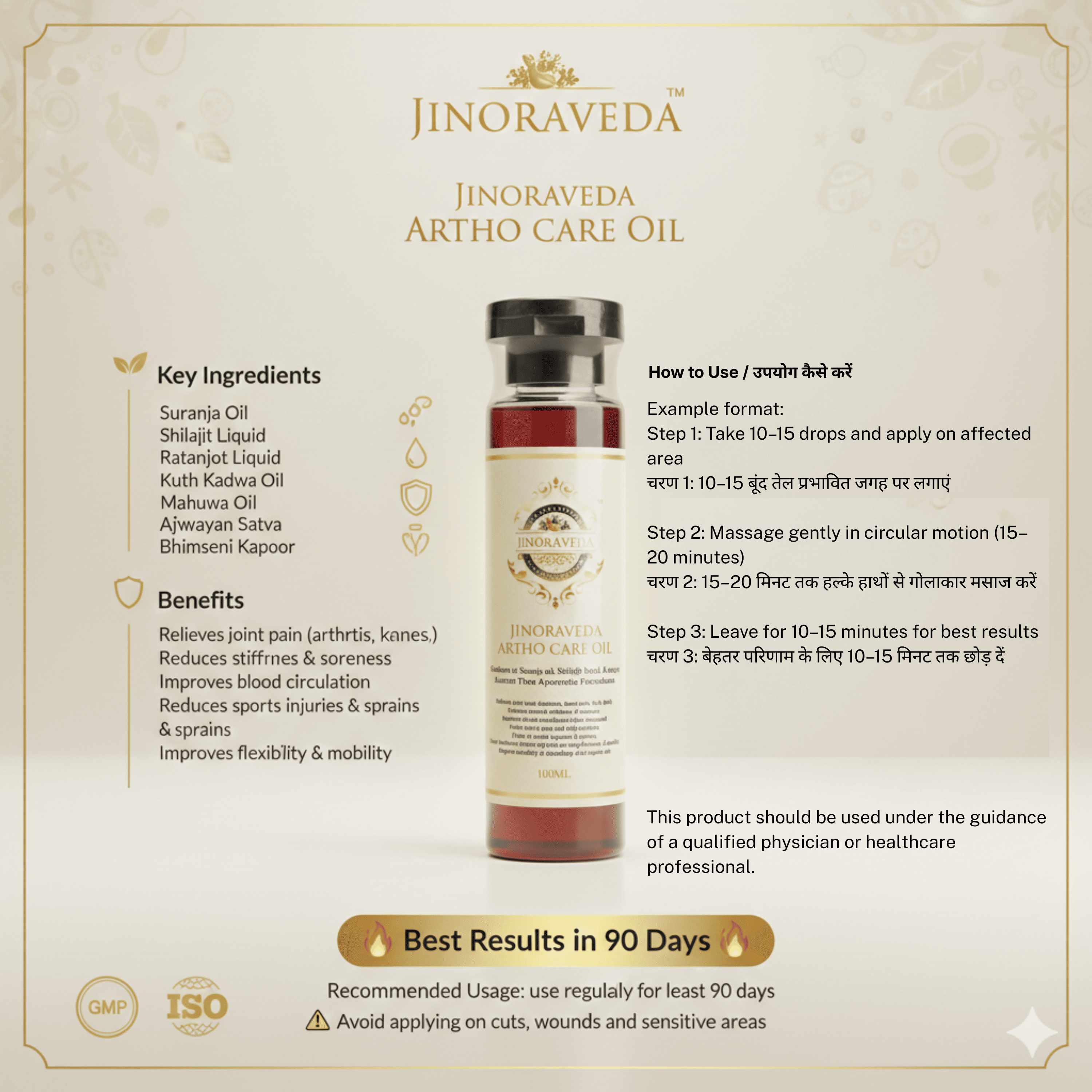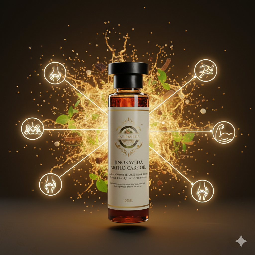 Experience the power of ancient Ayurveda with JINORAVEDA Artho Care Oil, a premium herbal formulation designed to provide effective relief from joint pain, stiffness and inflammation. Enriched with powerful natural ingredients like Suranja Oil, Shilajit Liquid and Ratanjot, this oil deeply penetrates to promote better blood circulation and faster recovery.