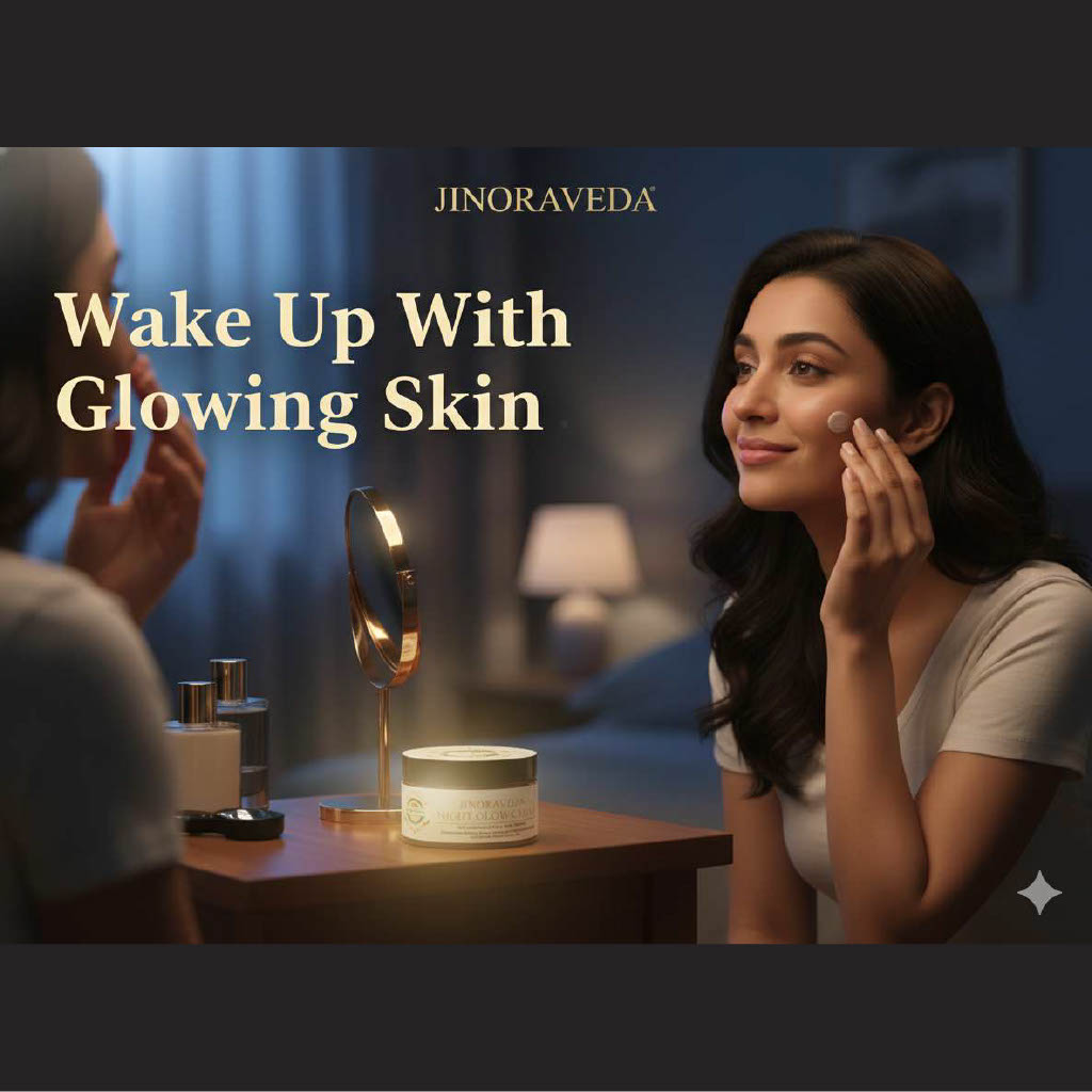 JINORAVEDA Night Glow Cream works overnight to repair, nourish and rejuvenate your skin. It deeply hydrates and helps reduce pigmentation, dullness and uneven skin tone.